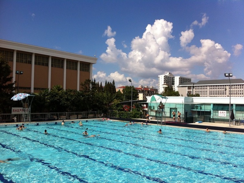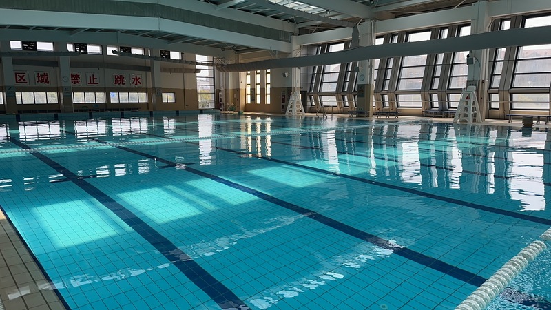 To the east of the stadium is the swimming pool, which was put into use in 2019. The designed number of users is 400 (calculated based on 2 square meters per person), with a supporting green area of 1157.74 square meters, and a design service life of 50 years. The swimming pool is divided into a shallow water area of 1.2 meters and a deep water area of 1.8 meters. The thermostatic swimming pool uses 24-hour automatic circulation and automatic dosing to ensure water quality. The swimming pool is managed by a professional team with 24 lifeguards, as well as 12 staff for ensuring water quality, security, cleaning and stoker. A professional property management company is responsible for the daily maintenance and lifesaving work of the swimming pool.
